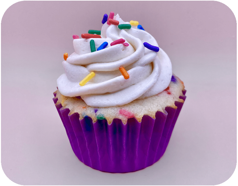 Vanilla cake with rainbow sprinkles and a hint of almond, topped with creamy vanilla buttercream frosting and garnished with more sprinkles.