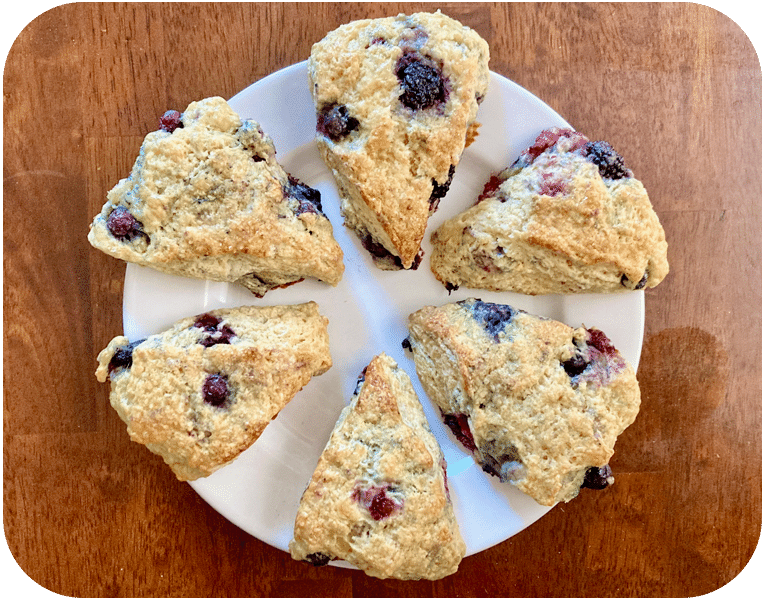 Soft buttermilk scones bursting with blueberries, blackberries, and raspberries, sprinkled with coarse sugar
