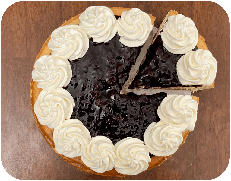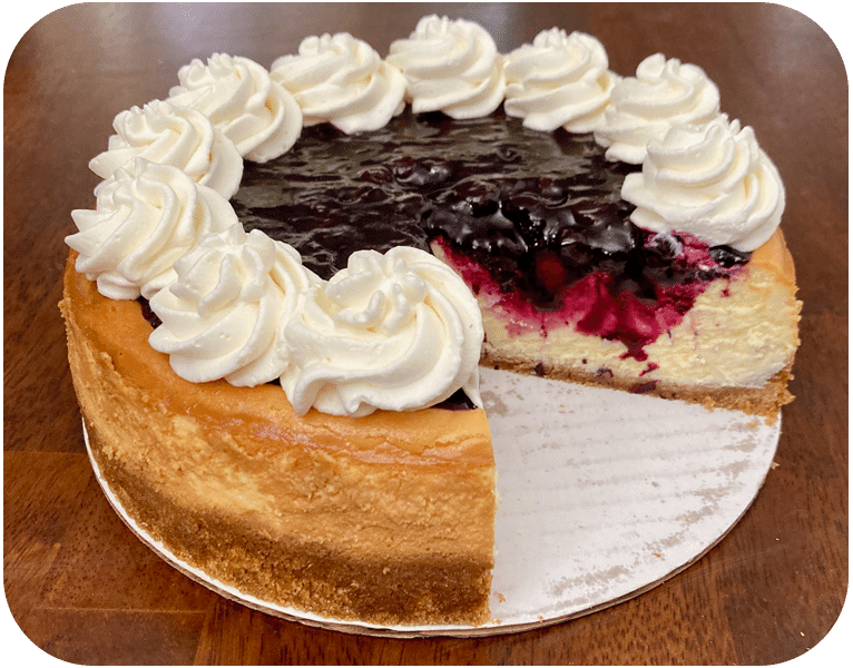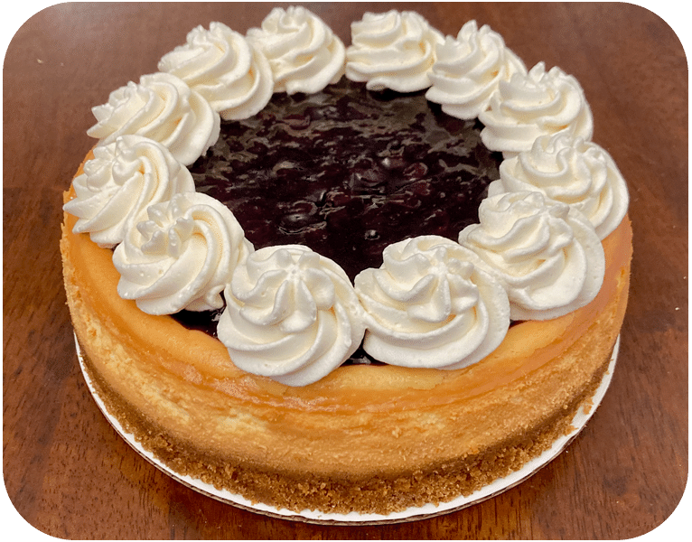Tangy lemon cheesecake with graham cracker crust and juicy blueberry compote topping