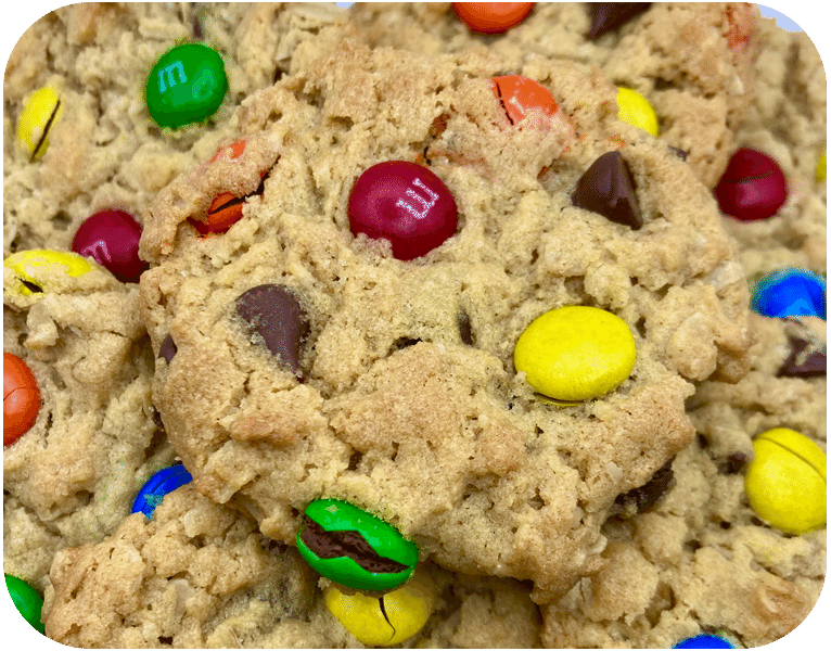 Chewy peanut butter oatmeal cookies with chocolate chips and M&Ms