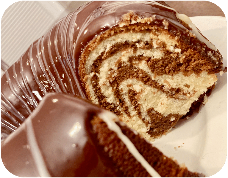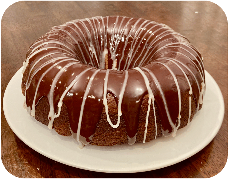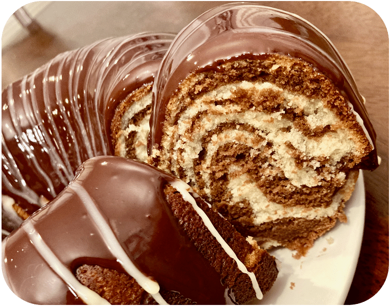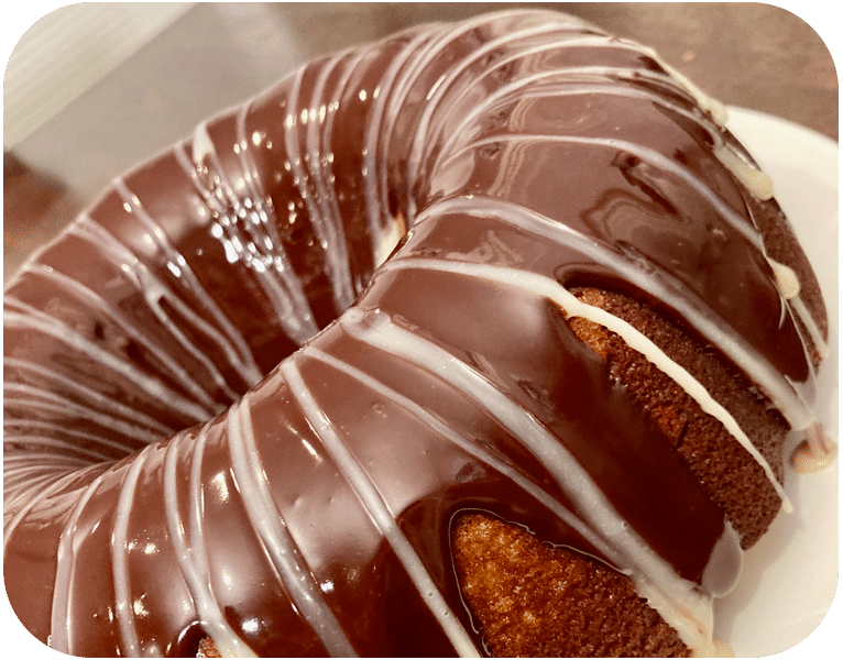 Chocolate and vanilla swirled bundt cake with dark chocolate ganache and white chocolate drizzle